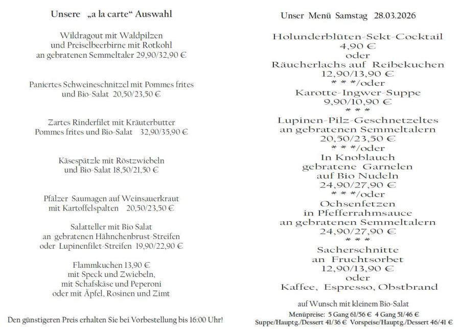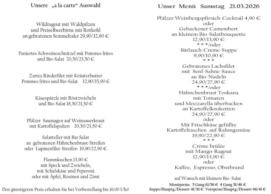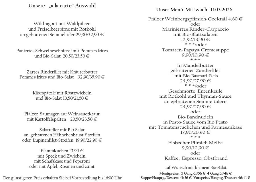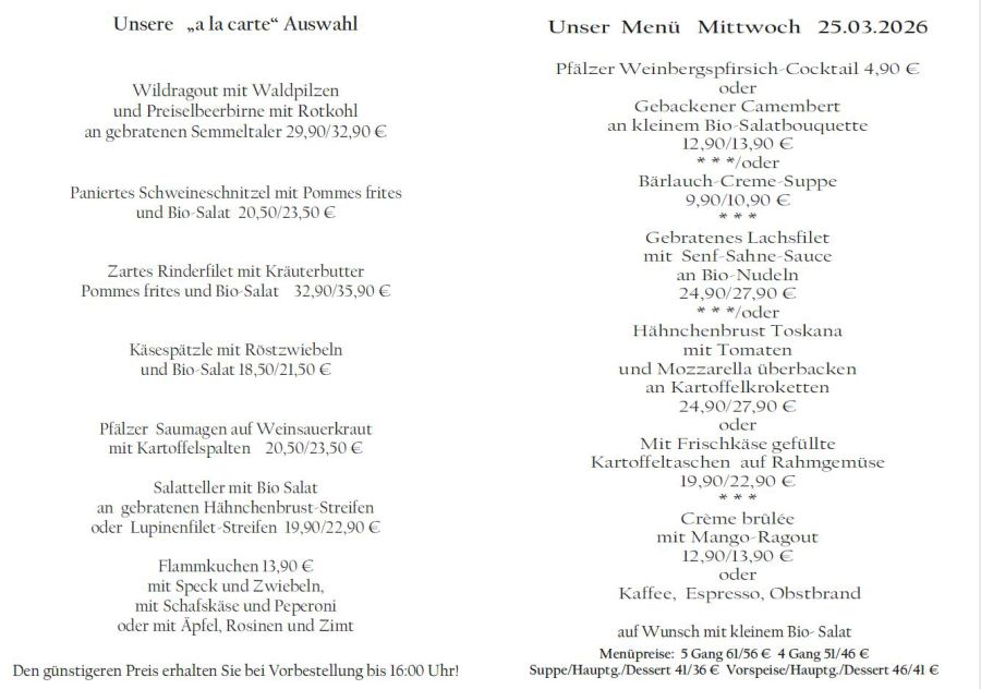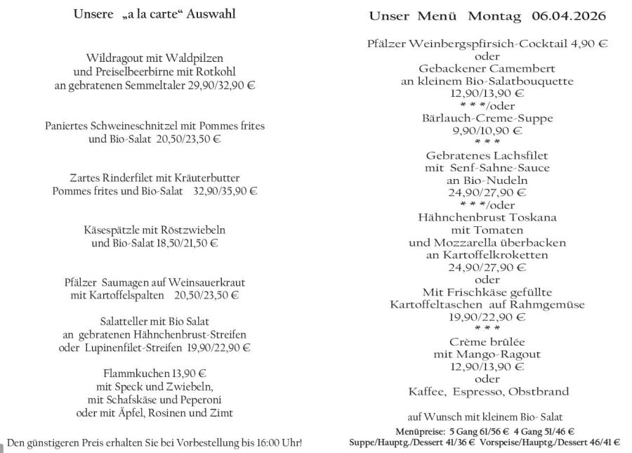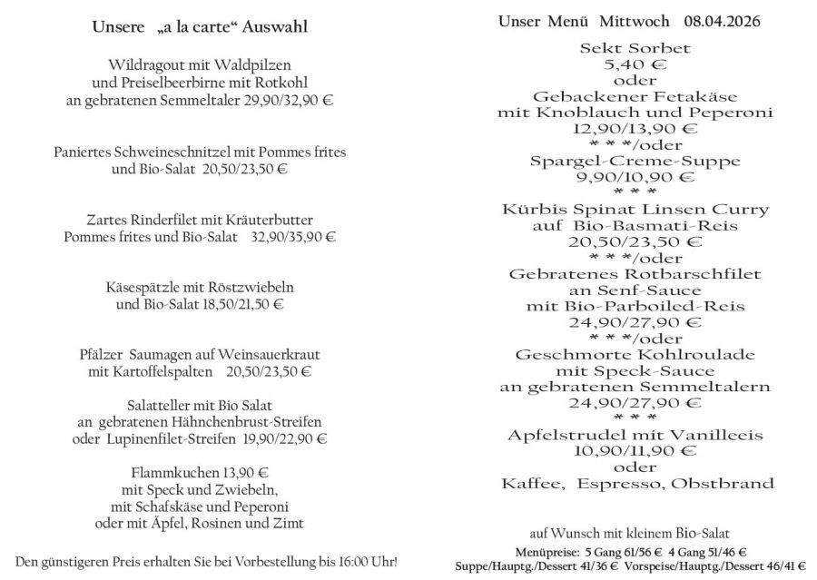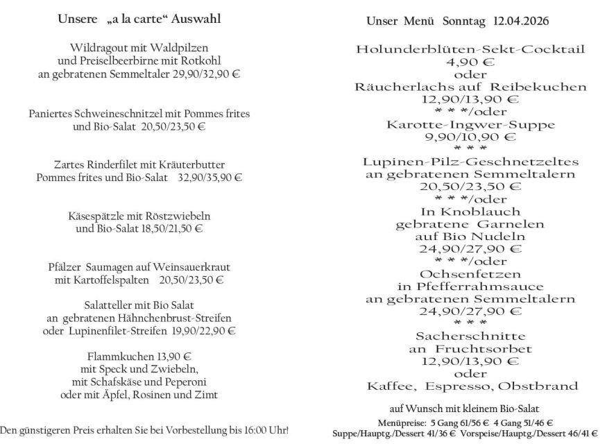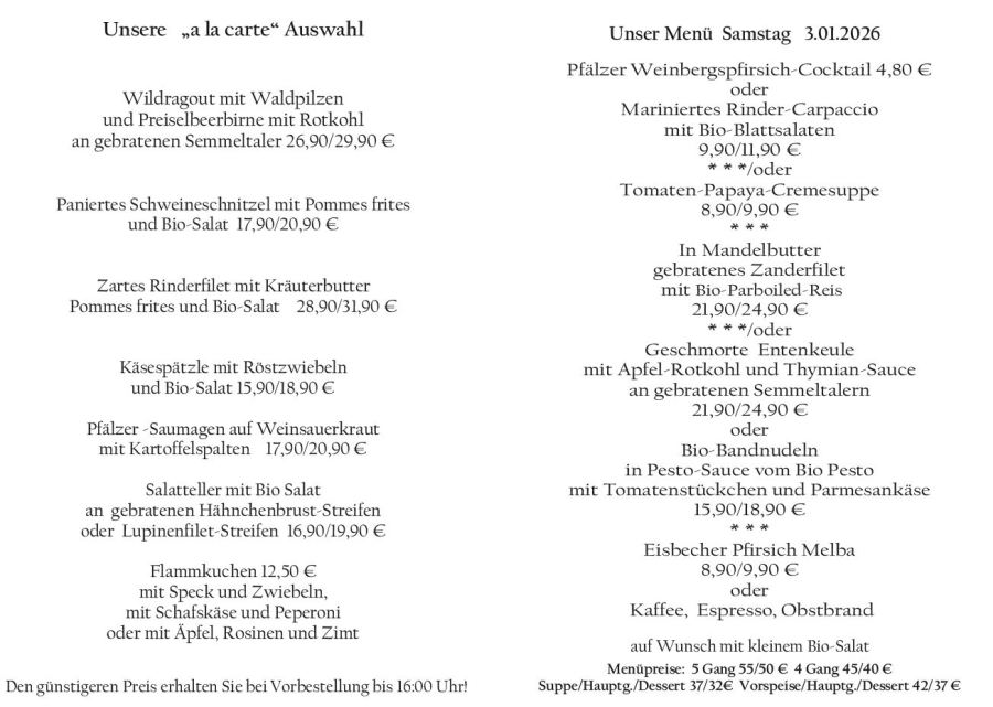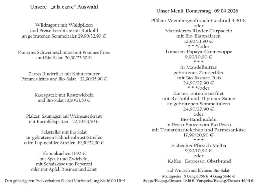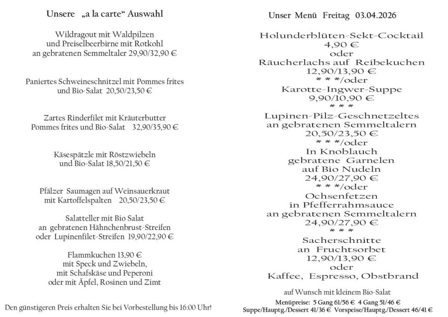 Wenn Sie Ihre Gerichte oder Menüs bis 16:00 Uhr vorbestellen, erhalten Sie hierfür den ermäßigten Preis.