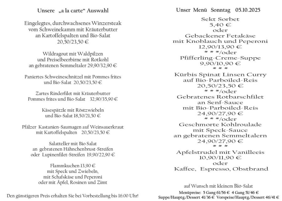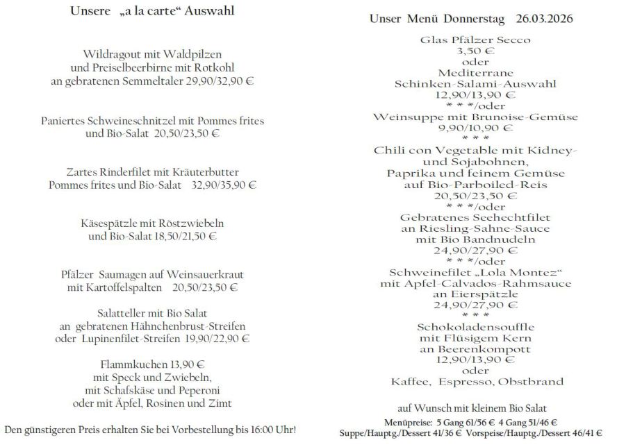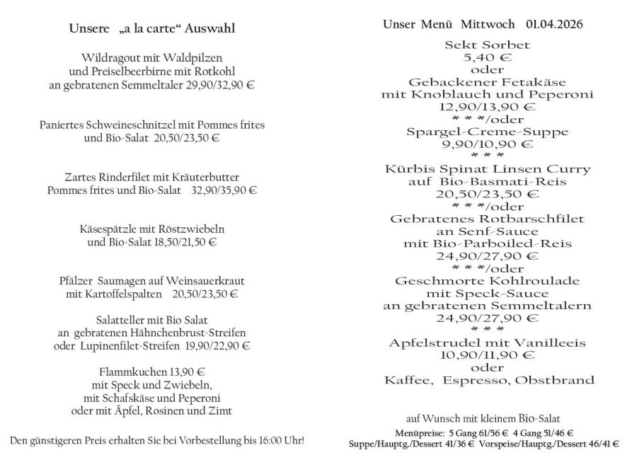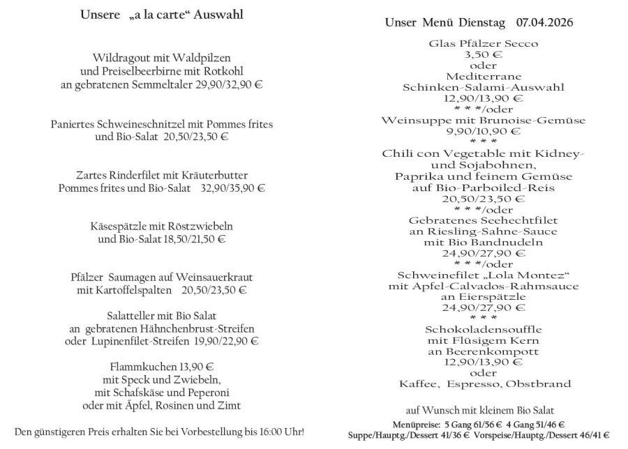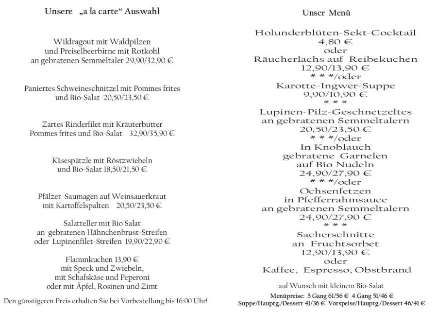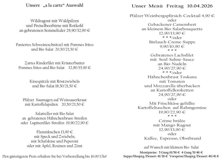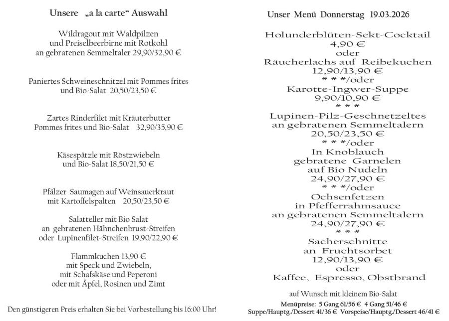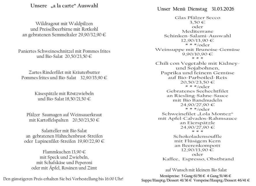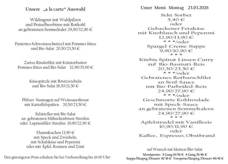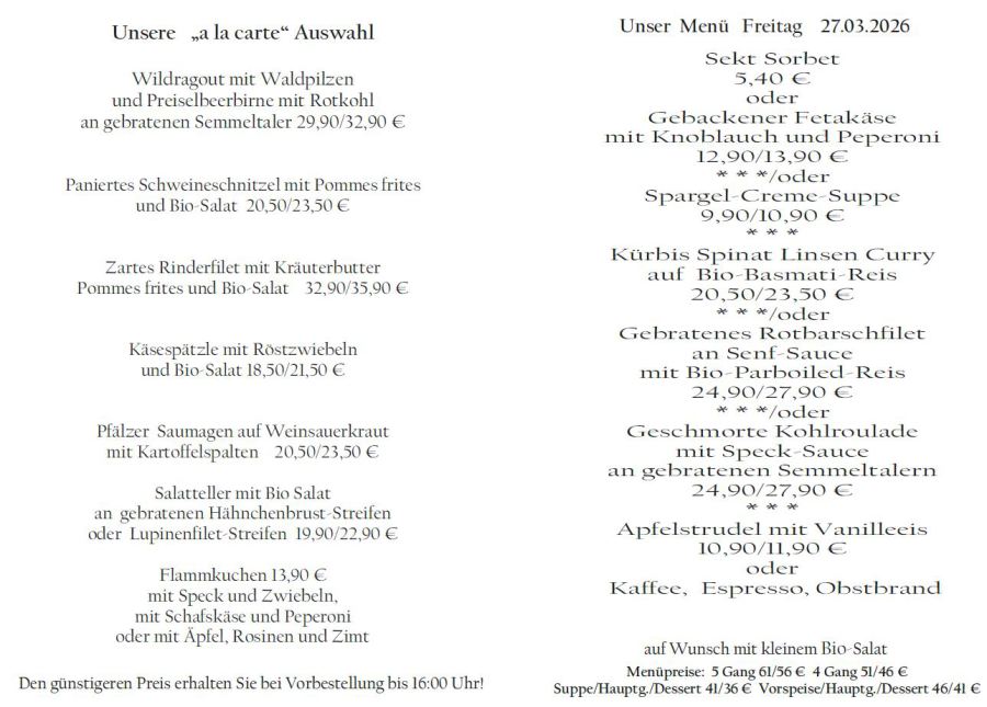Wenn Sie Ihre Gerichte oder Menüs bis 16:00 Uhr vorbestellen, erhalten Sie hierfür den ermäßigten Preis.