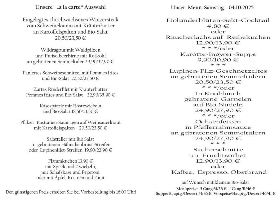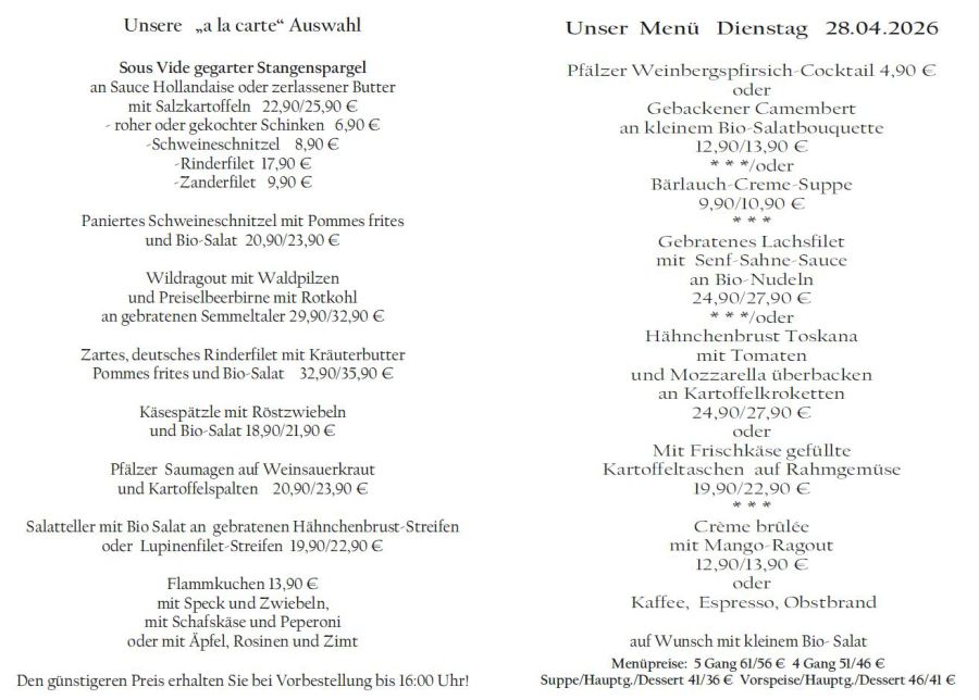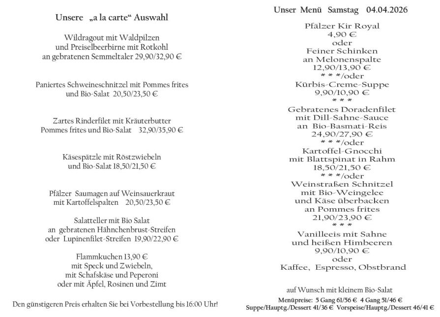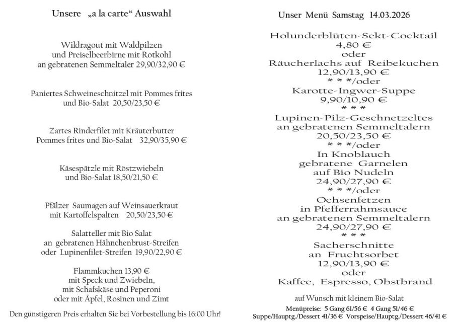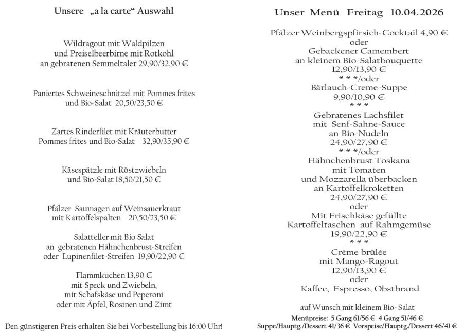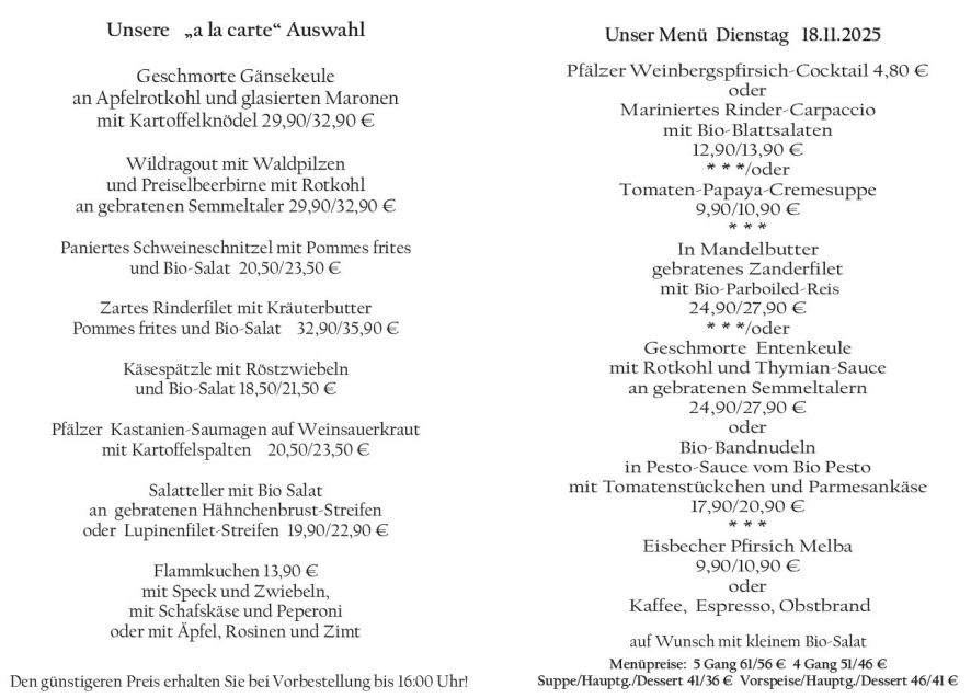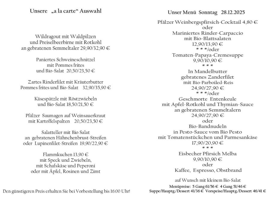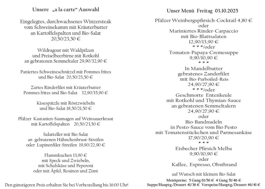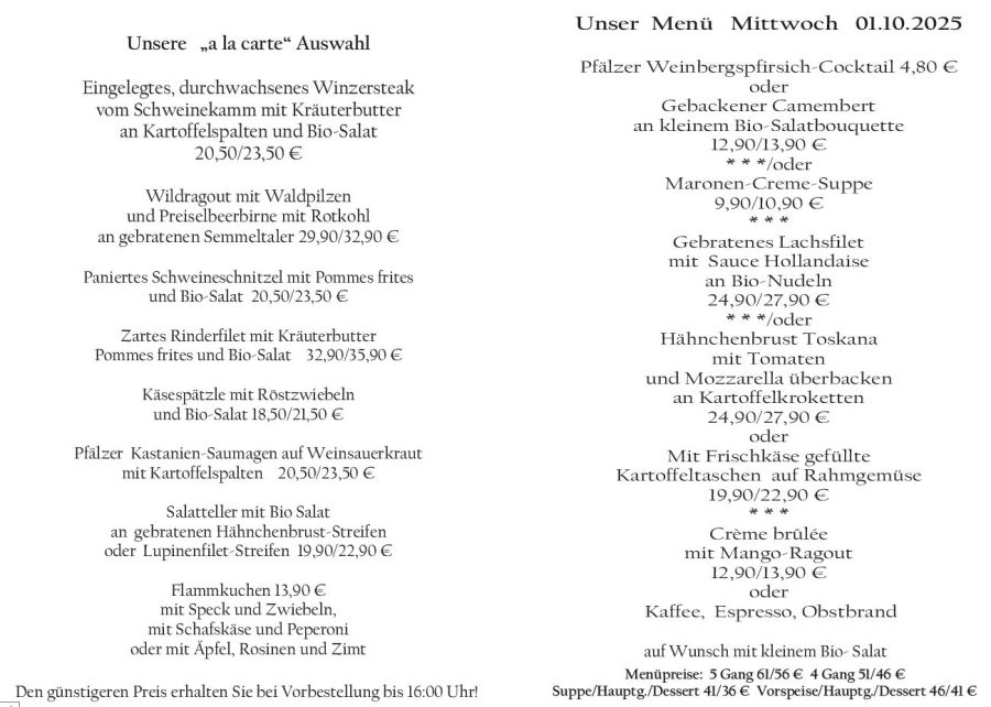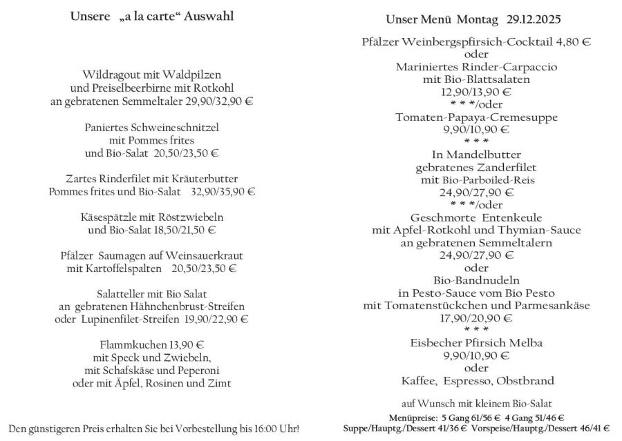 Wenn Sie Ihre Gerichte oder Menüs bis 16:00 Uhr vorbestellen, erhalten Sie hierfür den ermäßigten Preis.