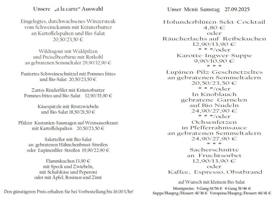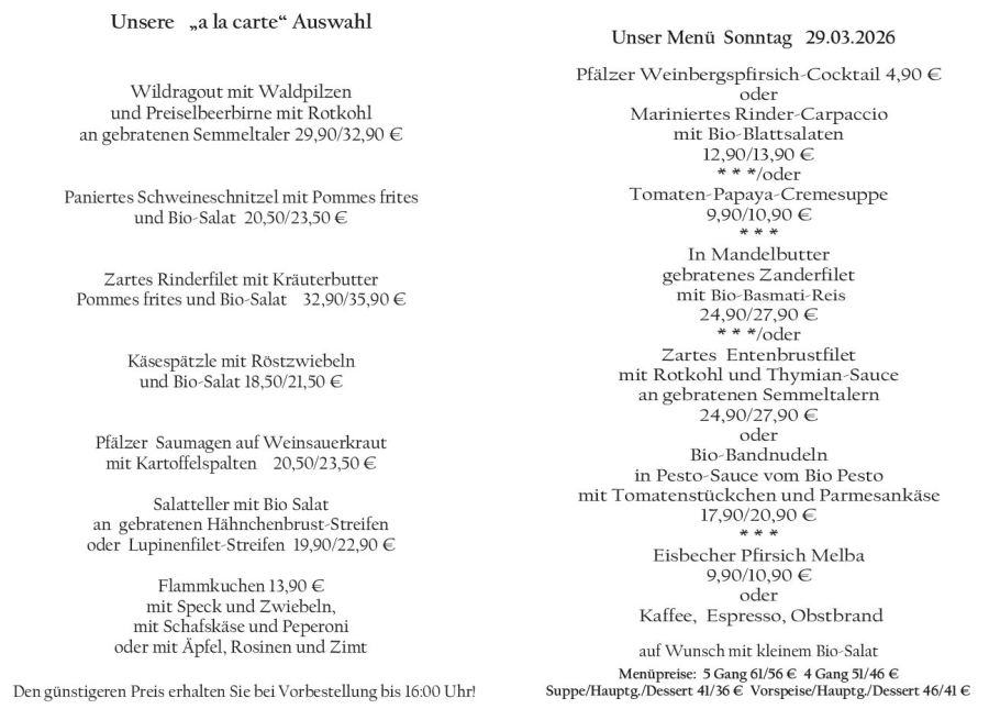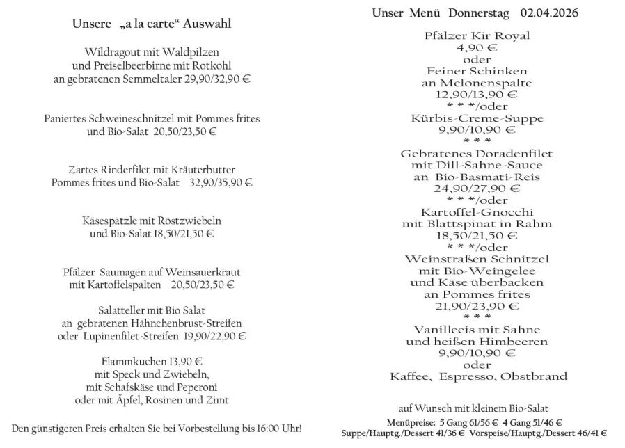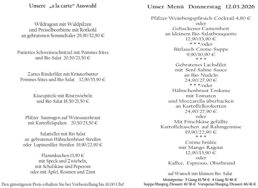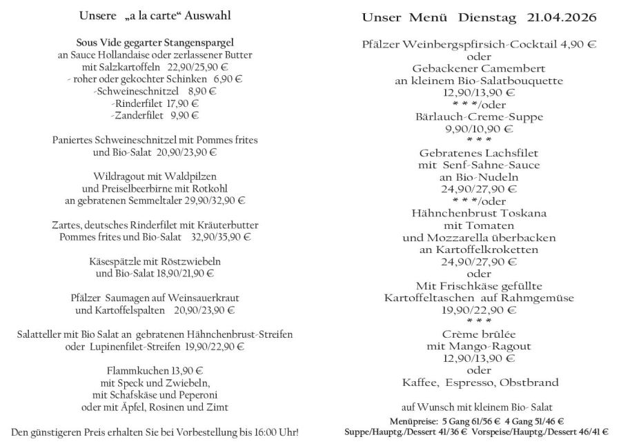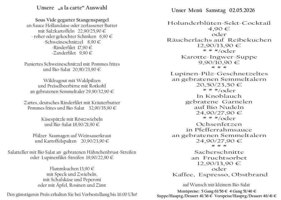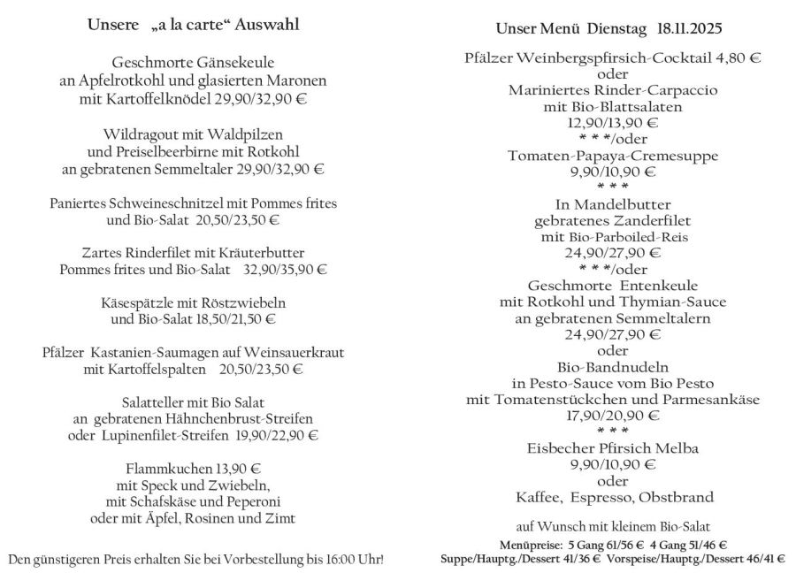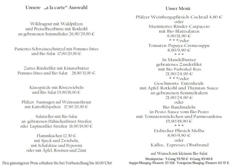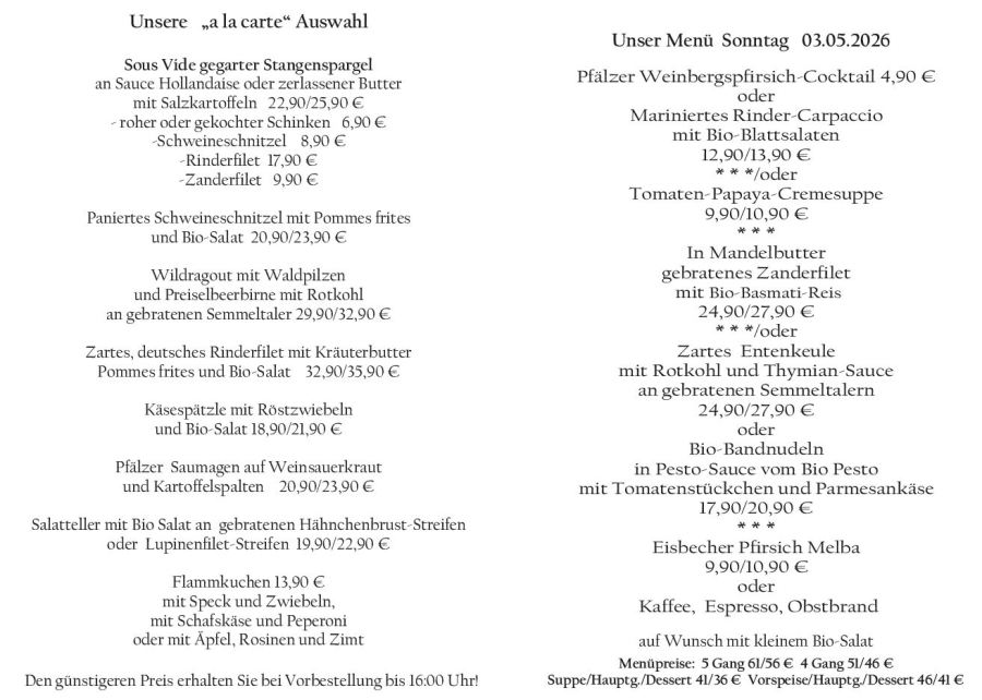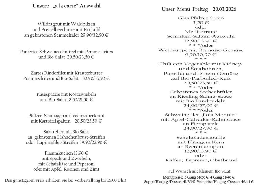 Wenn Sie Ihre Gerichte oder Menüs bis 16:00 Uhr vorbestellen, erhalten Sie hierfür den ermäßigten Preis.