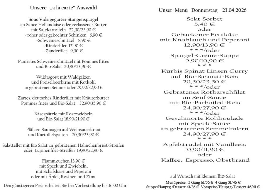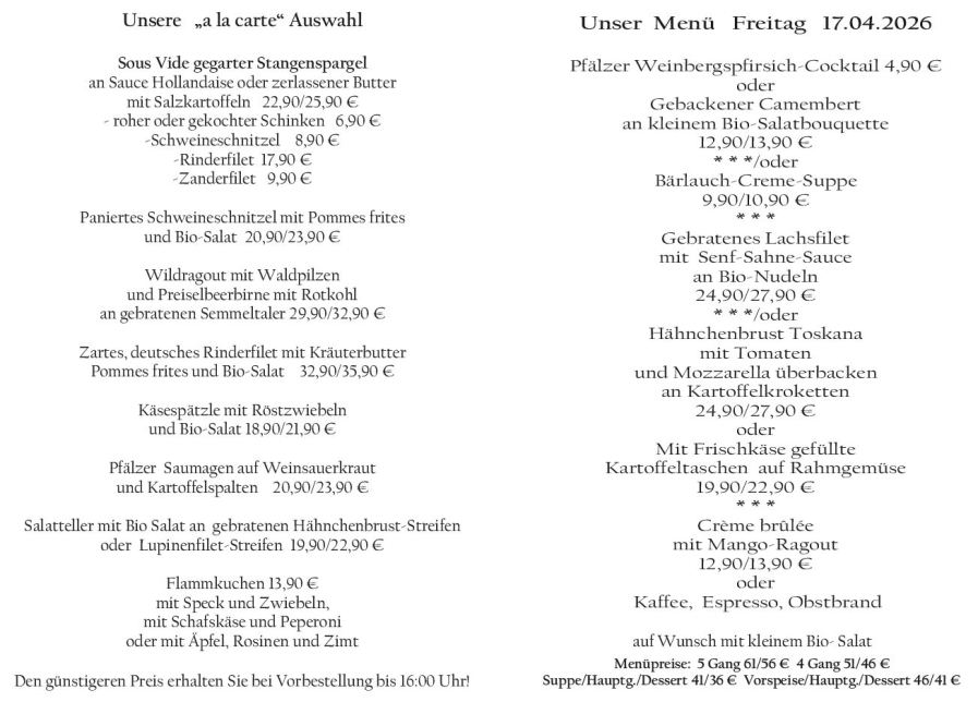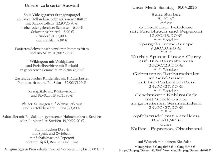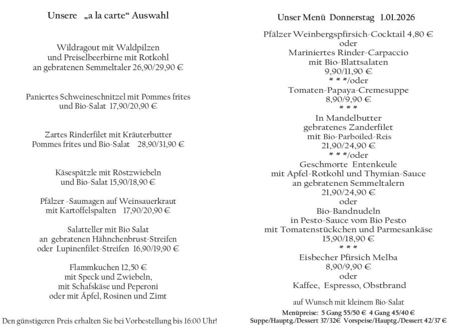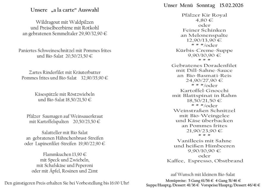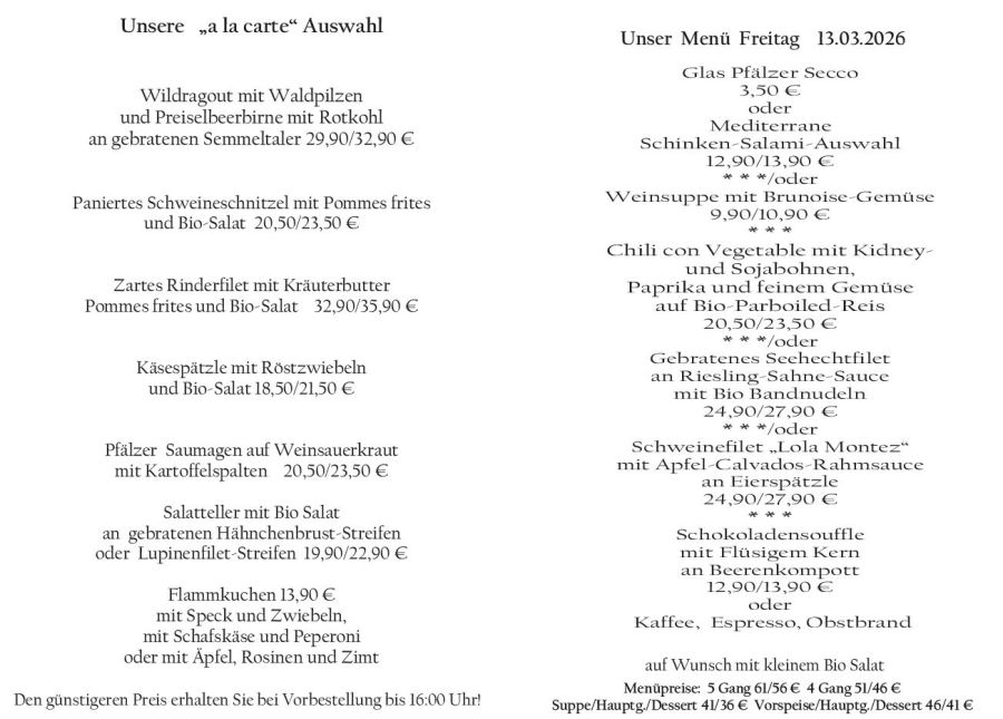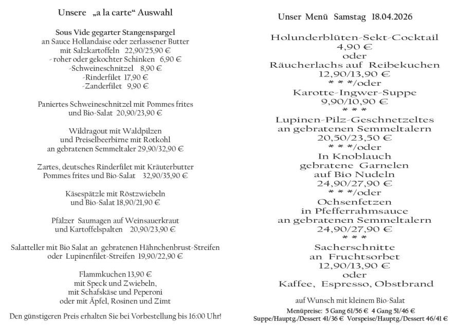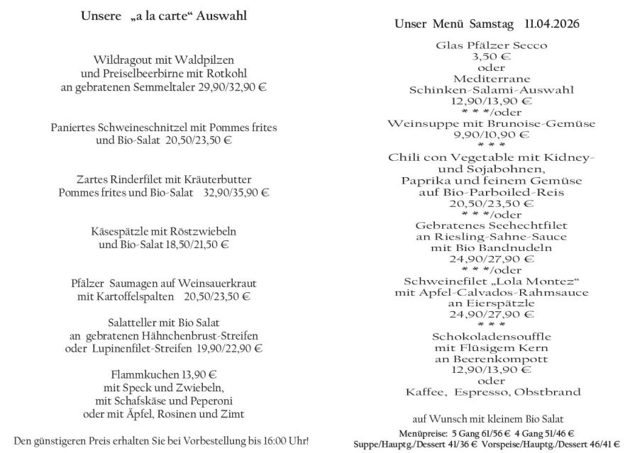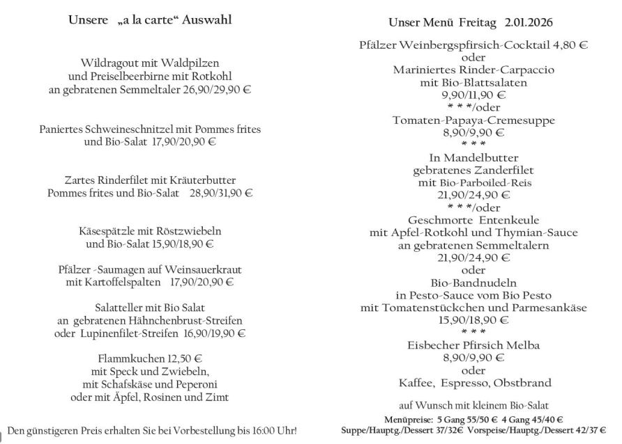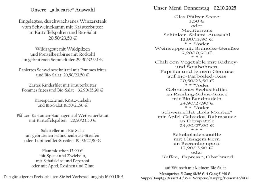 Wenn Sie Ihre Gerichte oder Menüs bis 16:00 Uhr vorbestellen, erhalten Sie hierfür den ermäßigten Preis.