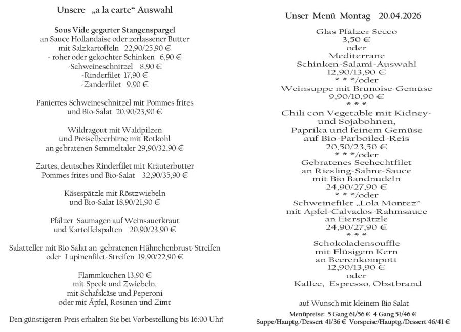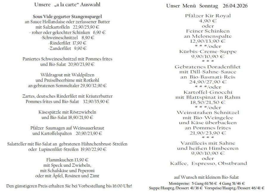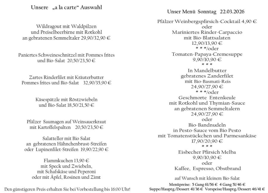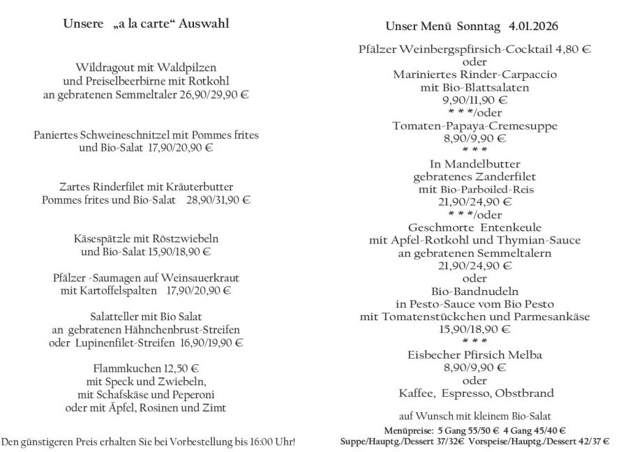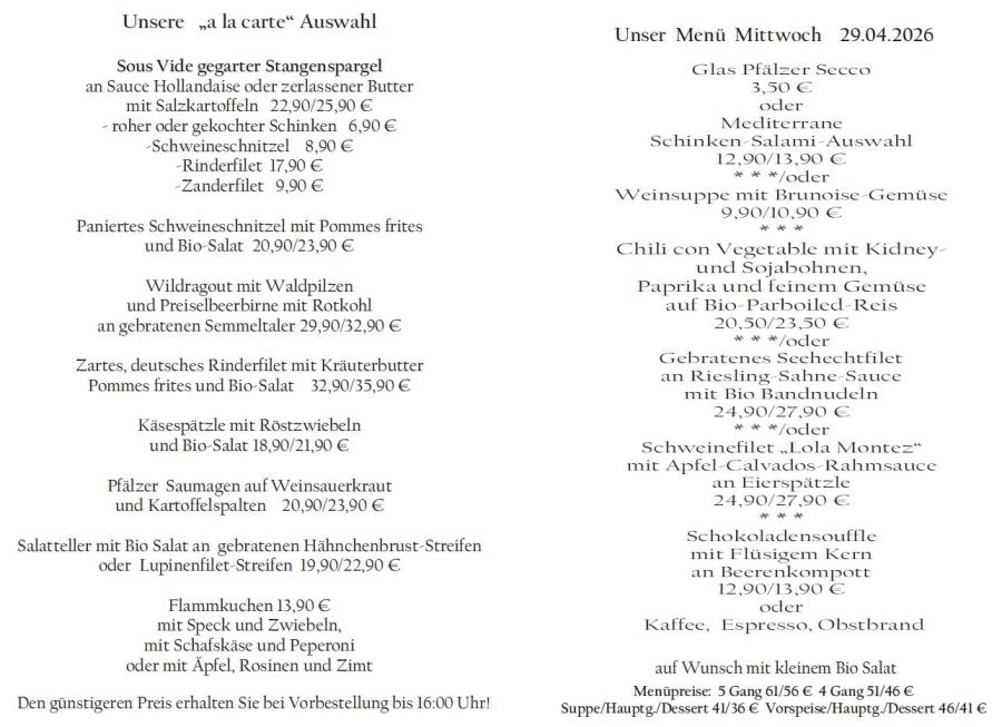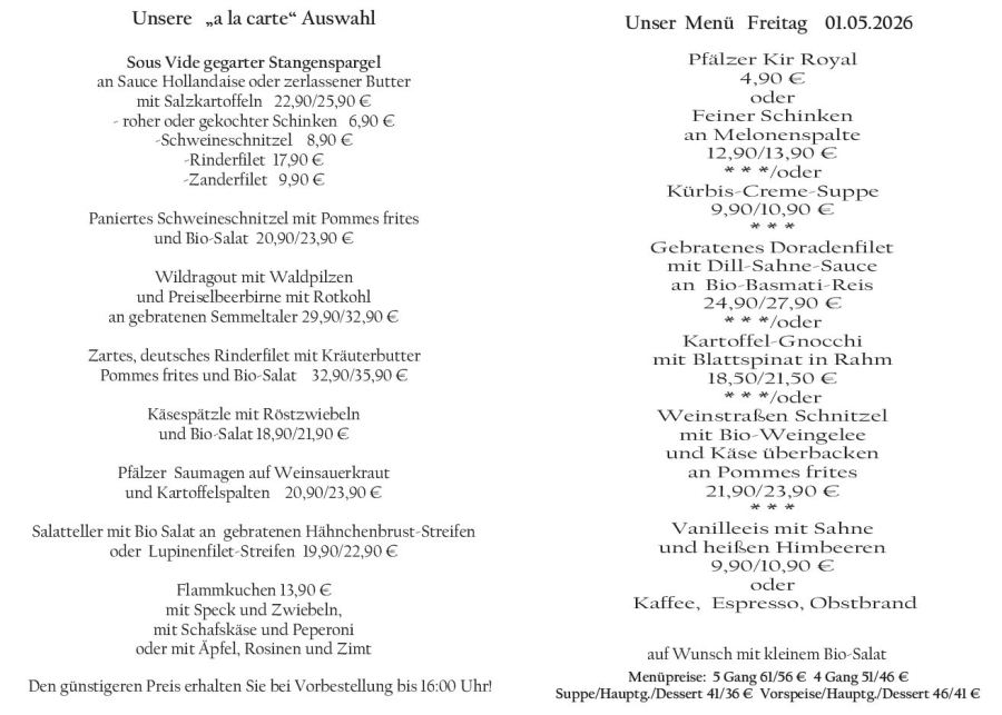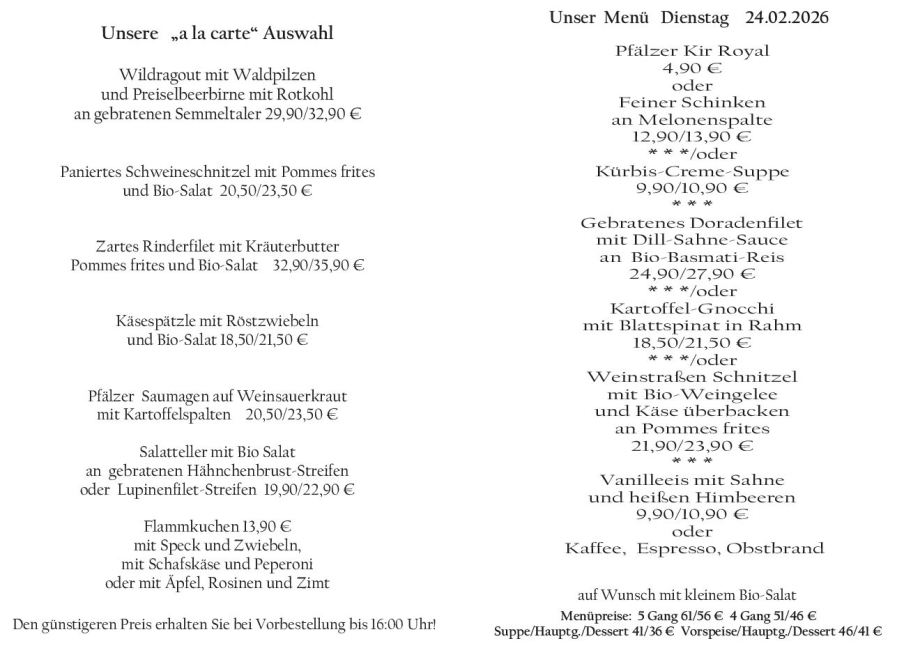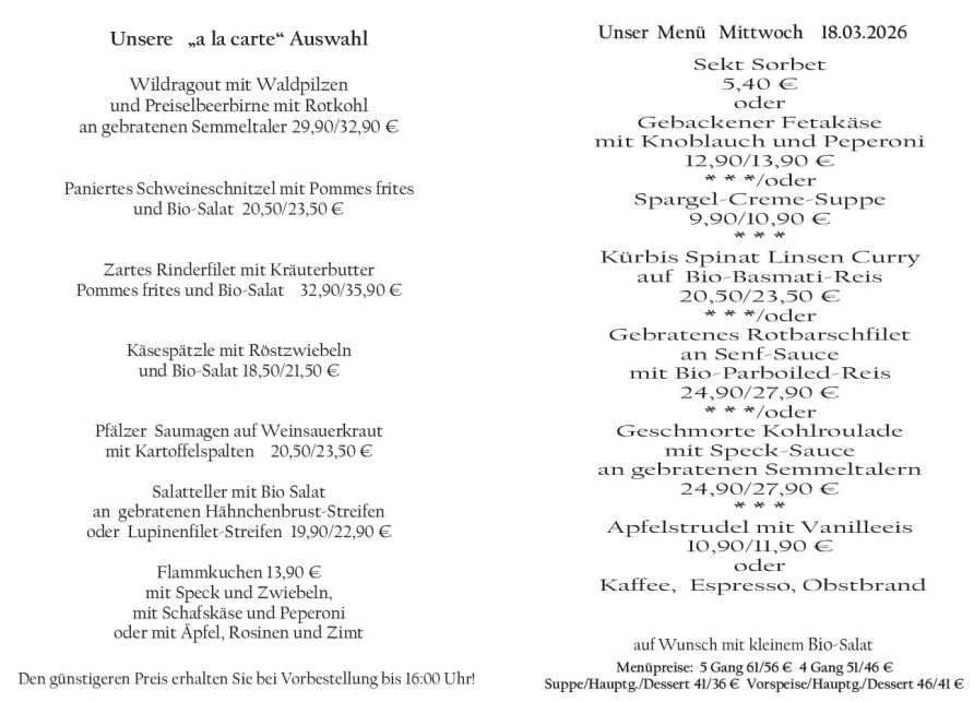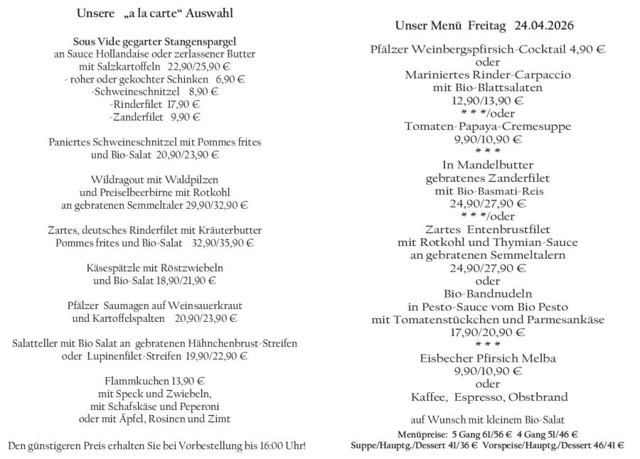 Wenn Sie Ihre Gerichte oder Menüs bis 16:00 Uhr vorbestellen, erhalten Sie hierfür den ermäßigten Preis.