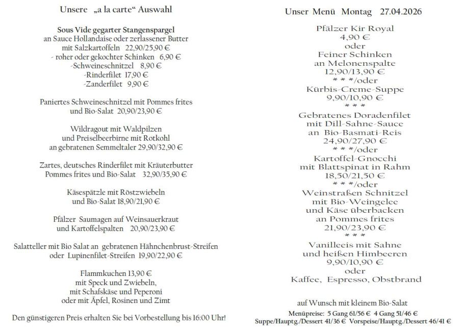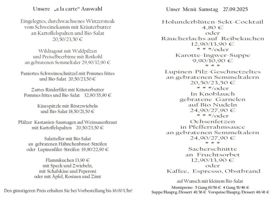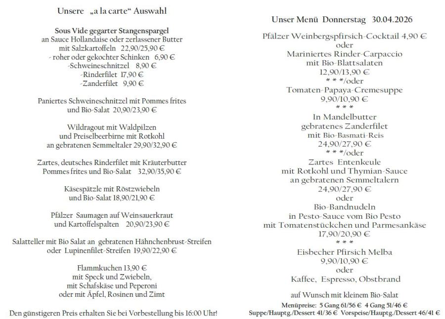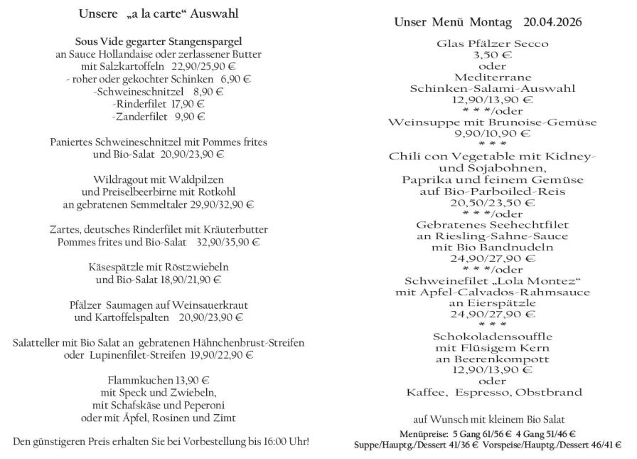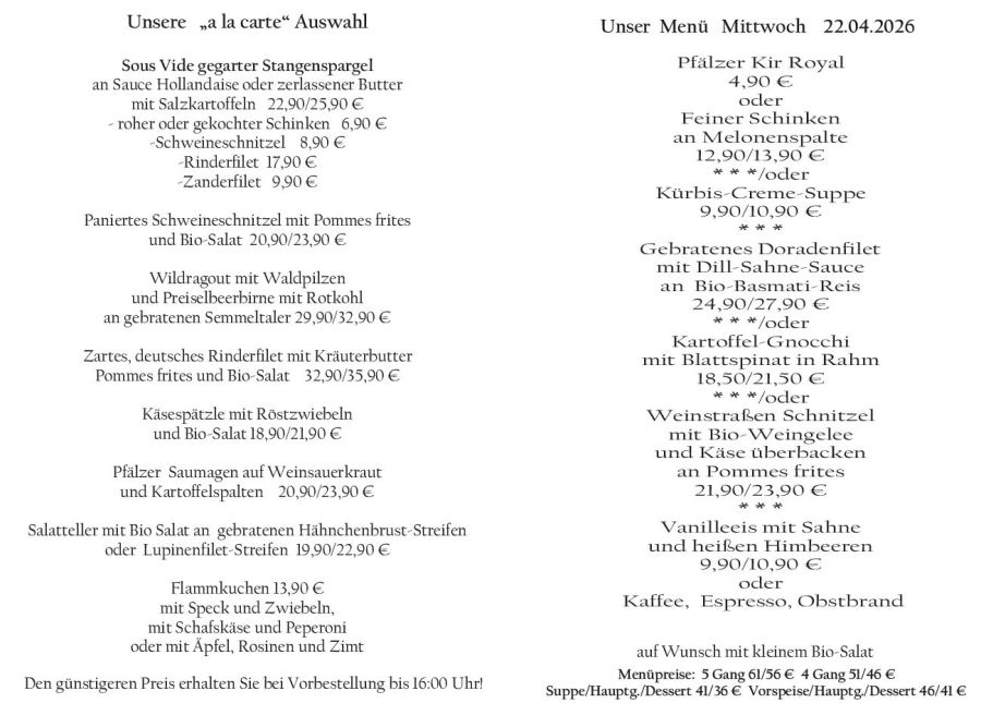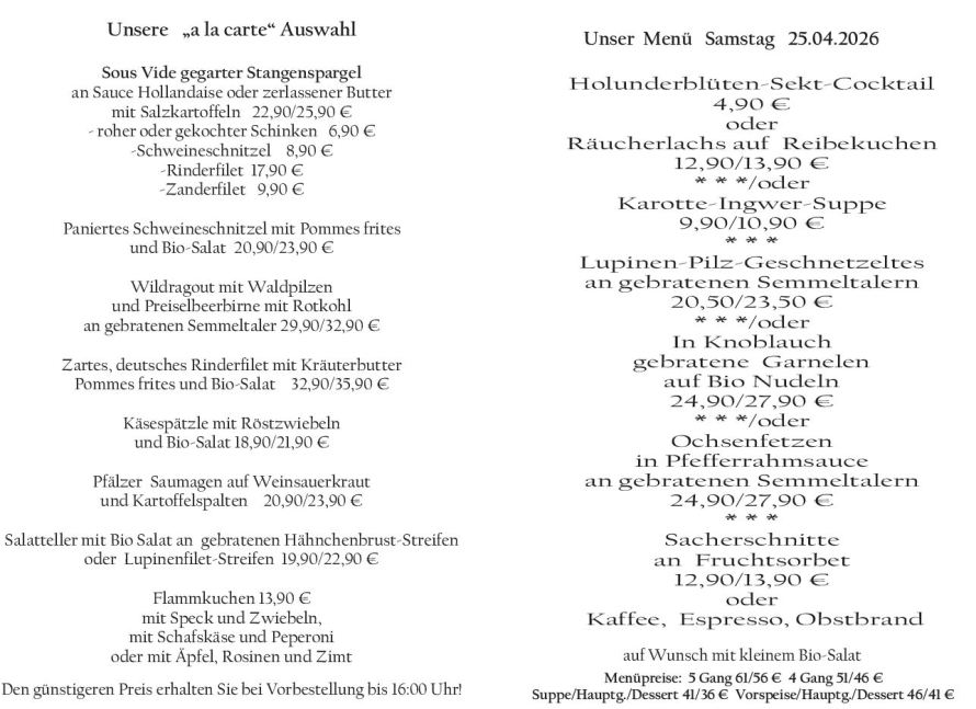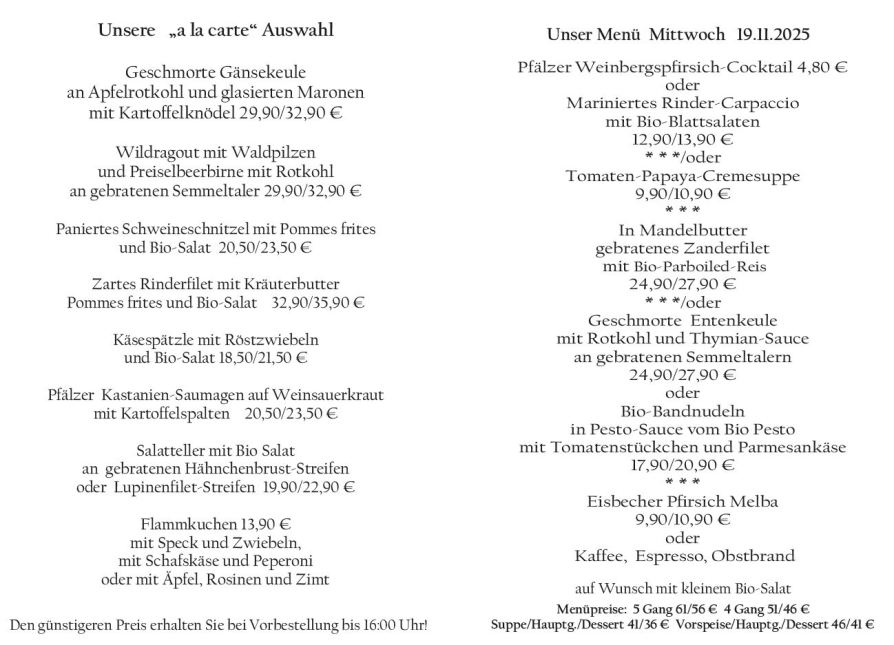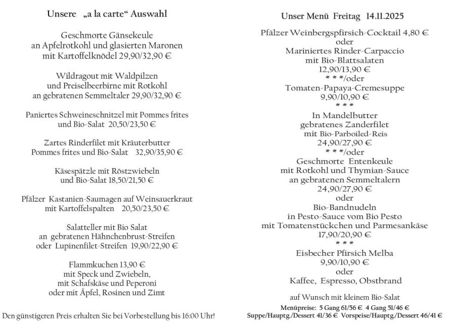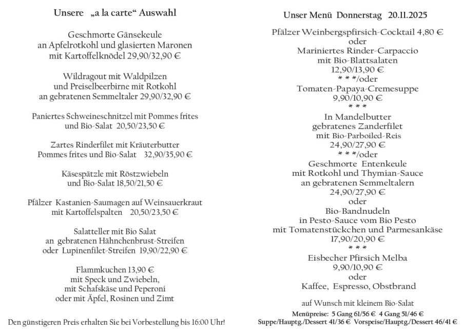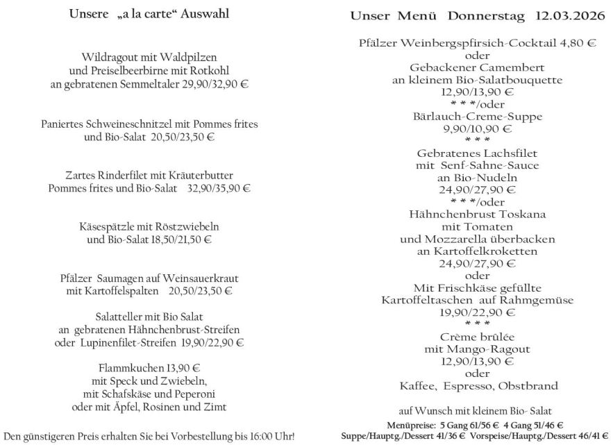 Wenn Sie Ihre Gerichte oder Menüs bis 16:00 Uhr vorbestellen, erhalten Sie hierfür den ermäßigten Preis.